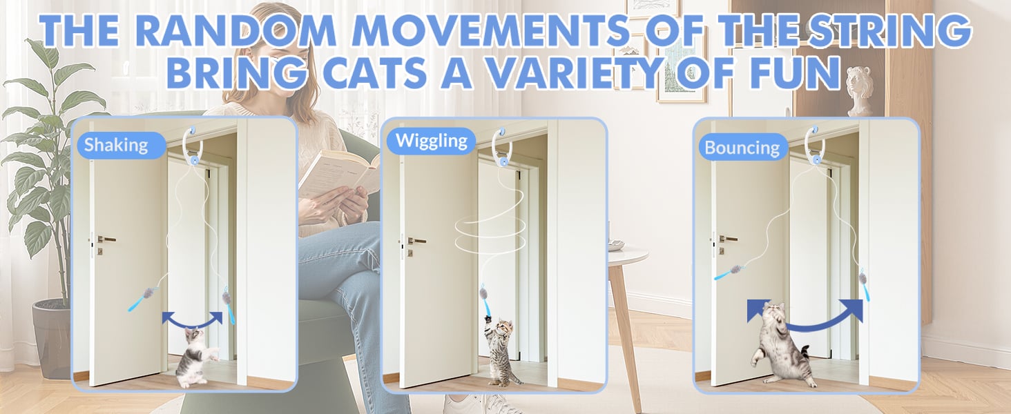 Hang the interactive cat toys for indoor cats to a door frame or handle and watch them wiggle and dance when your cat interacts with them. With just one captivating toy, you can provide an entertaining play experience for your beloved feline, helping to reduce boredom and anxiety—ideal for when you're not at home.