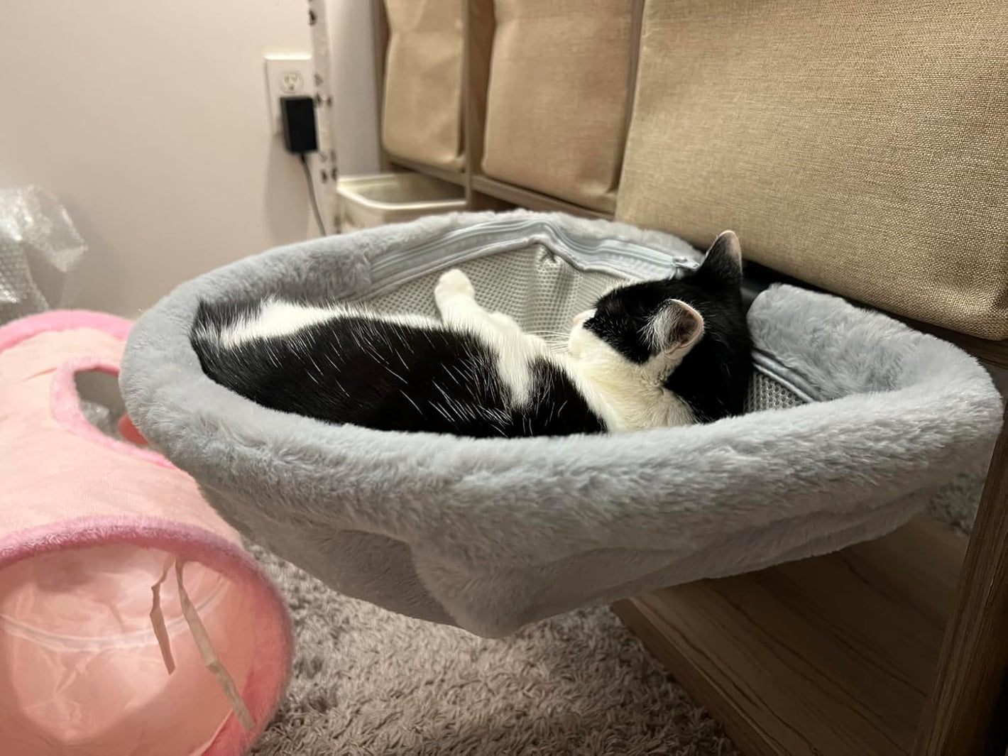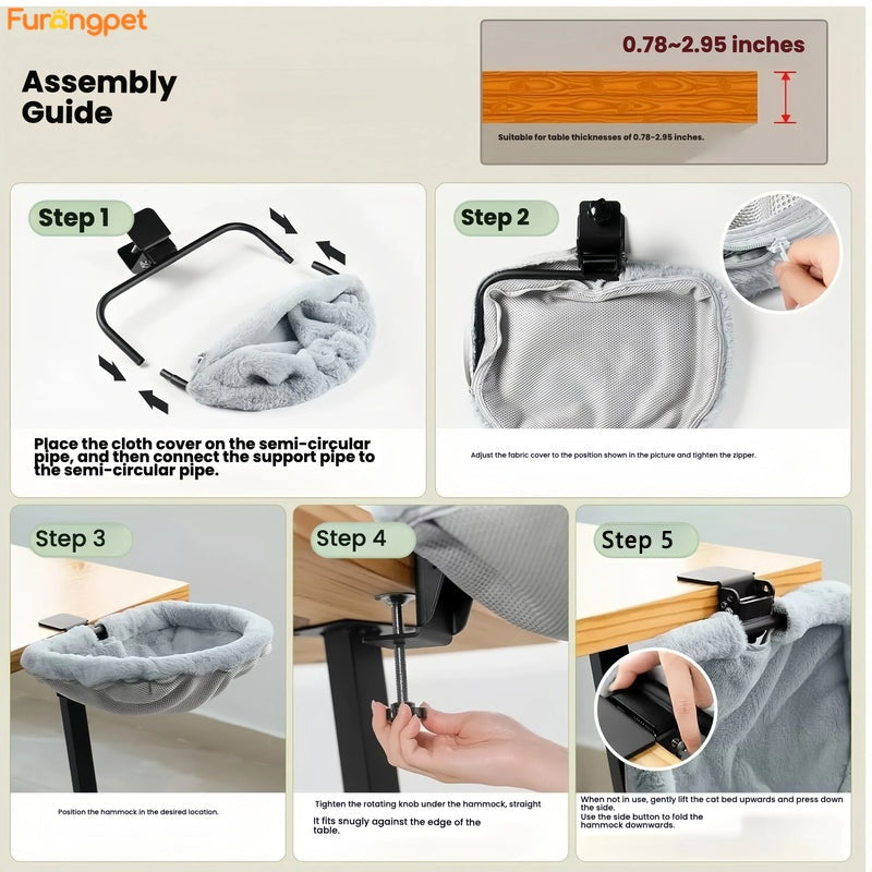 Create a cozy shared workspace for you and your cat with this desk-side cat bed. Designed to attach neatly to the edge of your desk, it gives your cat a comfortable place to rest nearby without taking over your keyboard or work area. The semi-enclosed shape supports your cat’s natural curled-up sleeping position, helping them feel secure and relaxed while staying close to you.
